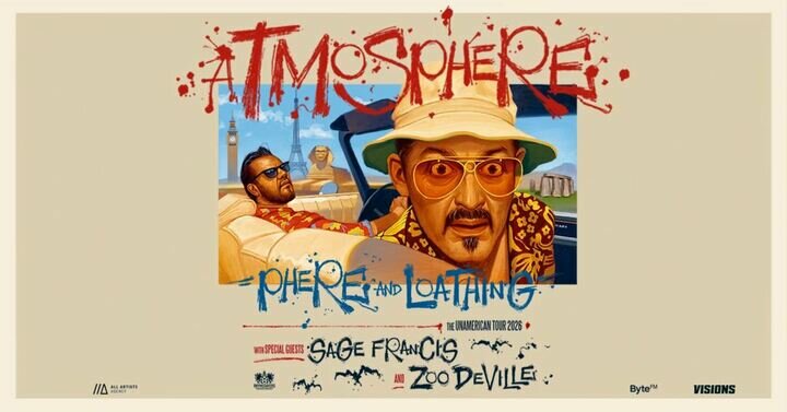 Mit Special Guests Sage Francis und ZooDeVille gehen Atmosphere 2026 endlich wieder auf Reise. Drei Jahrzehnte nach ihren Anfängen stehen Slug und Ant weiterhin für kompromisslosen Independent Hip-Hop, gemischt mit Geschichten, Beats und viel Gefühl.